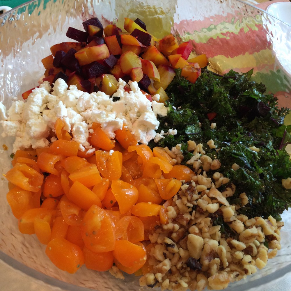 On my recent trip to Colorado, I had an amazing beet salad at an unlikely location- the airport. When we arrived in Denver, we were so hungry that we stopped for some snacks at the closest place to our gate. It happened to be a healthy eating place, and in the refrigerator case they had salads, hummus, local kombucha and other treats. I decided to have the beet salad, and it was incredible! The flavor of roasted beets pairs so well with goat cheese, and the texture of the kale. The downside to this airport lunch? The salad was $14.00!